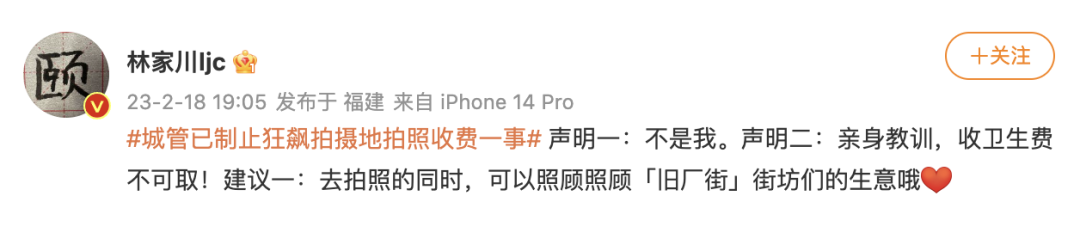 2月18日19时许,《狂飙》中唐小龙的扮演者林家川就此事发微博:“声明一:不是我。声明二:亲身教训,收卫生费不可取!建议一:去拍照的同时,可以照顾照顾「旧厂街」街坊们的生意哦!”