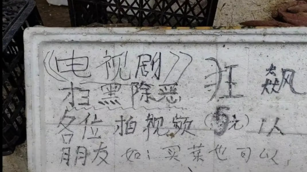 视频中,旁边的菜摊前摆着的泡沫板上写着“各位拍视频5元1人,如买菜也可以”。