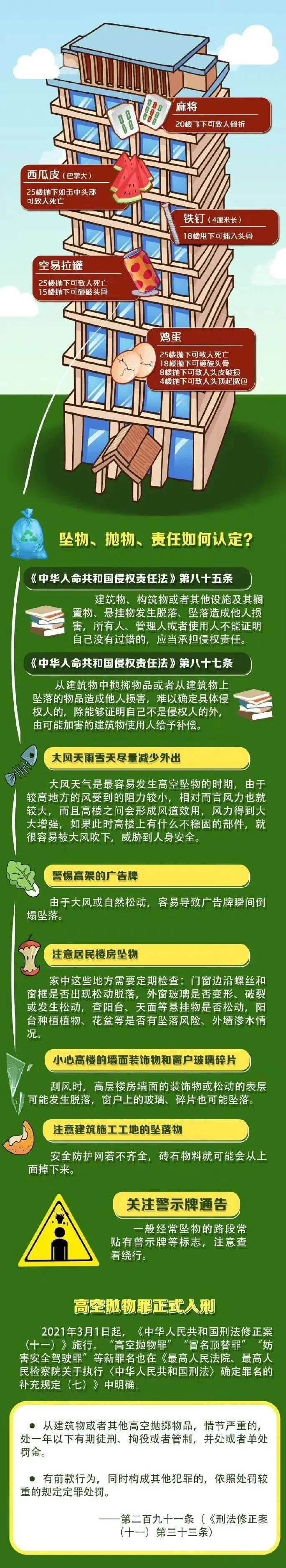 近日,云南昆明一所小学附近正值放学高峰一把菜刀,突然从天而降监控显示就差1秒菜刀险些砸到一个小女孩 目前相关部门已介入调查 网友表示:危险!严惩! 最高人民法院印发的《关于依法妥善审理高空抛物、坠物案件的意见》规定对于故意高空抛物的根据具体情形按以危险方法危害公共安全罪、故意伤害罪或故意杀人罪论处特定情形要从重处罚 [align=inherit]《*****刑法》 从建筑物或者其他高空抛掷物品,情节严重的,处一年以下有期徒刑、拘役或者管制,并处或者单处罚金。有前款行为,同时构成其他犯罪的,依照处罚较重的规定定罪处罚。此外,春季冷暖空气交替容易出现大风要及时清理阳台、窗台加强安全管理防止高空坠物伤人事故案例 1月30日,广东惠州一酒店大楼高处重物坠落,导致地面1人死亡,3人受伤。 随着城市高层建筑的增多高空坠物就像是悬在城市上空的“利剑”时刻威胁着人们的安全高空抛物危害有多大?该如何预防?一起来了解一下 来源:综合自中国应急管理、杭州应急管理、滁州消防