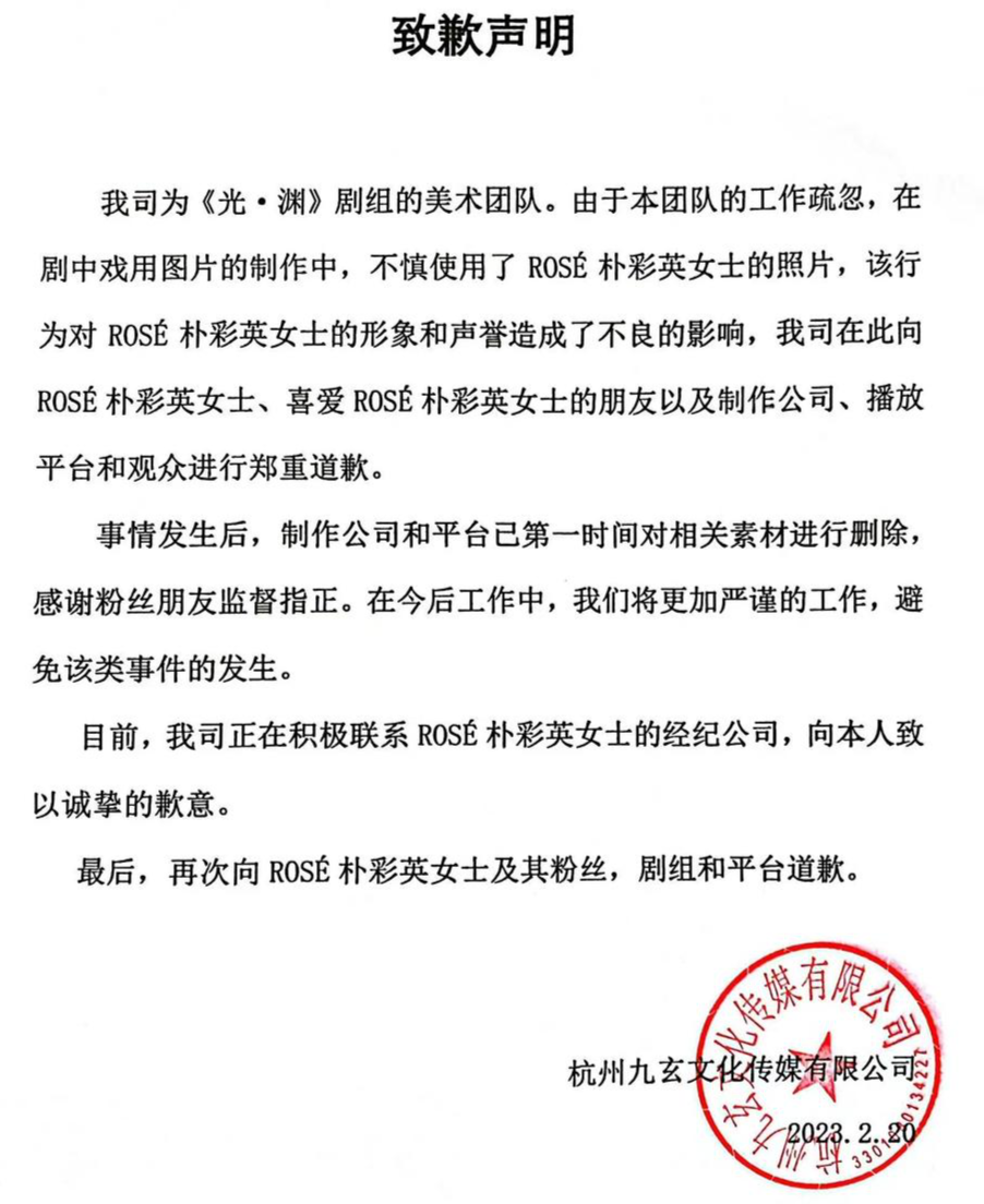 改编自悬疑小说《默读》,由张新成、付辛博主演的《光渊》目前正在热播。有观众发现,剧组居然把韩国女团BlackPink成员朴彩英的照片用作道具照片,引发争议。 网友晒出的剧中道具照片和朴彩英本人照片稍后,该剧的美术团队发出“致歉声明”,表示:由于本团队的工作疏忽,在剧中戏用图片的制作中,不慎使用了ROSé朴彩英女士的照片,该行为对ROSé朴彩英女士的形象和声誉造成了不良的影响,我司在此向ROSé朴彩英女士、喜爱ROSé朴彩英女士的朋友以及制作公司、播放平台和观众进行郑重道歉。 据称,事情发生后,制作公司和平台已第一时间对相关素材进行删除,公司正在积极联系ROSé朴彩英女士的经纪公司,向本人致以诚挚的歉意。据红星新闻了解,电视剧随意在网上找照片做剧中的道具照片并不罕见,此前悬疑剧《谁是凶手》播出时,就有观众发现,剧中出现的道具(受害人)的照片,竟然使用了著名演员宋茜的一张旧照。来源:红星新闻综合