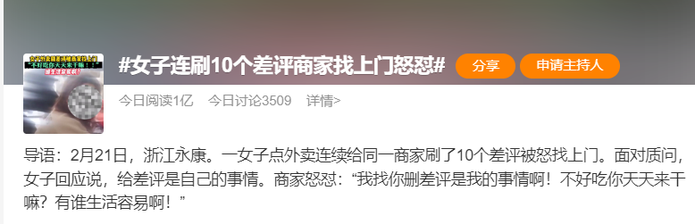 店主称,女子是自己店里的老顾客,因为前天微信问是否有好评返现,自己没回答,就给自己刷了10个差评。网友纷纷回应称