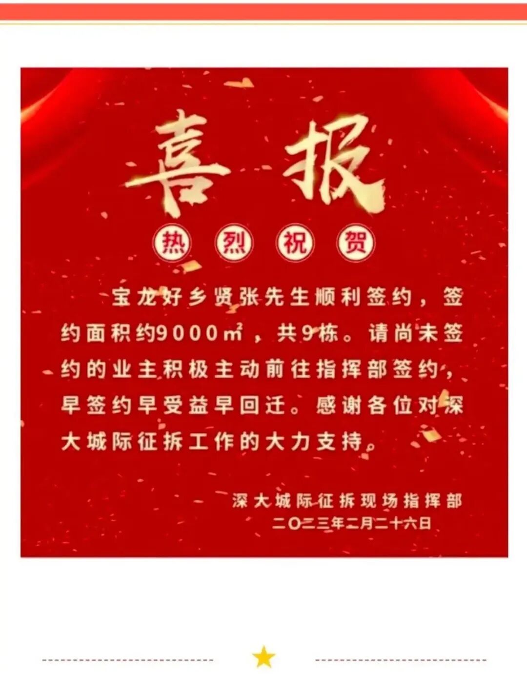 庆祝张先生签约拆迁9栋楼的喜报(图源:宝龙街道办官微)据宝龙街道官微此前介绍,深大城际是粤港澳大湾区和深圳市的重点轨道交通项目,起自深圳宝安国际机场,终至惠州市大亚湾,是实现深圳与大亚湾双城互联互通的干线,线路全长88.8公里。 宝龙街道南约片区“工业上楼”项目是全面实施深圳产业立市、制造业当家发展战略的最直接体现,项目以本次深大城际项目为契机,通过高强度、集约化开发,大幅提高住宅和厂房面积,挖掘土地利用潜力,寻求经济密度的突破口,为实现居民安居、产业空间突围提供深圳范例。 深大城际项目征拆涉及宝龙街道南约社区积谷田居民小组及大行居民小组。据地质勘察单位此前检测,南约沿线房屋下方存在大量溶洞、空洞、岩溶发育强烈,对地铁施工安全和辖区居民的财产安全及生命安全存在严重隐患。 据悉,深大城际、宝龙南约片区“工业上楼”项目集中拆除启动仪式于2月18日举行,后续将签约一栋、腾空一栋、拆除一栋,确保在3月15日前完成拆除任务。截至2月22日,深大城际、宝龙南约片区“工业上楼”征拆项目累计签约38户。