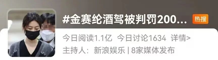 据韩媒报道,今(8)日上午,22岁的韩国演员金赛纶出席了首尔中央地方法院的首次审判,她因酒后驾驶并在发生事故后未采取任何措施,涉嫌违反道路交通法而遭到检方起诉,最终被法院判处罚款2000万韩元(约合超106000元人民币)。 微博截图 微博截图据报道,2022年5月18日,金赛纶在首尔江南一带驾车接连与护栏、树木以及配电箱相撞,导致街区停电,红绿灯停摆。警方接到报案后赶到现场,要求对其进行酒精检测,但金赛纶拒绝接受警方检测,坚持要去医院验血。而医院的血液检测结果显示,事发时金赛纶血液中的酒精含量已达到吊销驾照的标准。童星出道的金赛纶,在9岁时主演了电影《旅行者》。此后她又与元斌搭档,出演了电影《孤胆特工》,并凭借该片获得百想艺术大赏提名。近年来,金赛纶参演了多部影视作品。酒驾事件导致其新剧被换角,经纪公司也宣布不再与她续签合约。网友纷纷感叹:“必须封杀吧”“一手好牌打得太烂啊妹妹”“大好前程就这么被自己毁了”……来源:红星新闻综合
