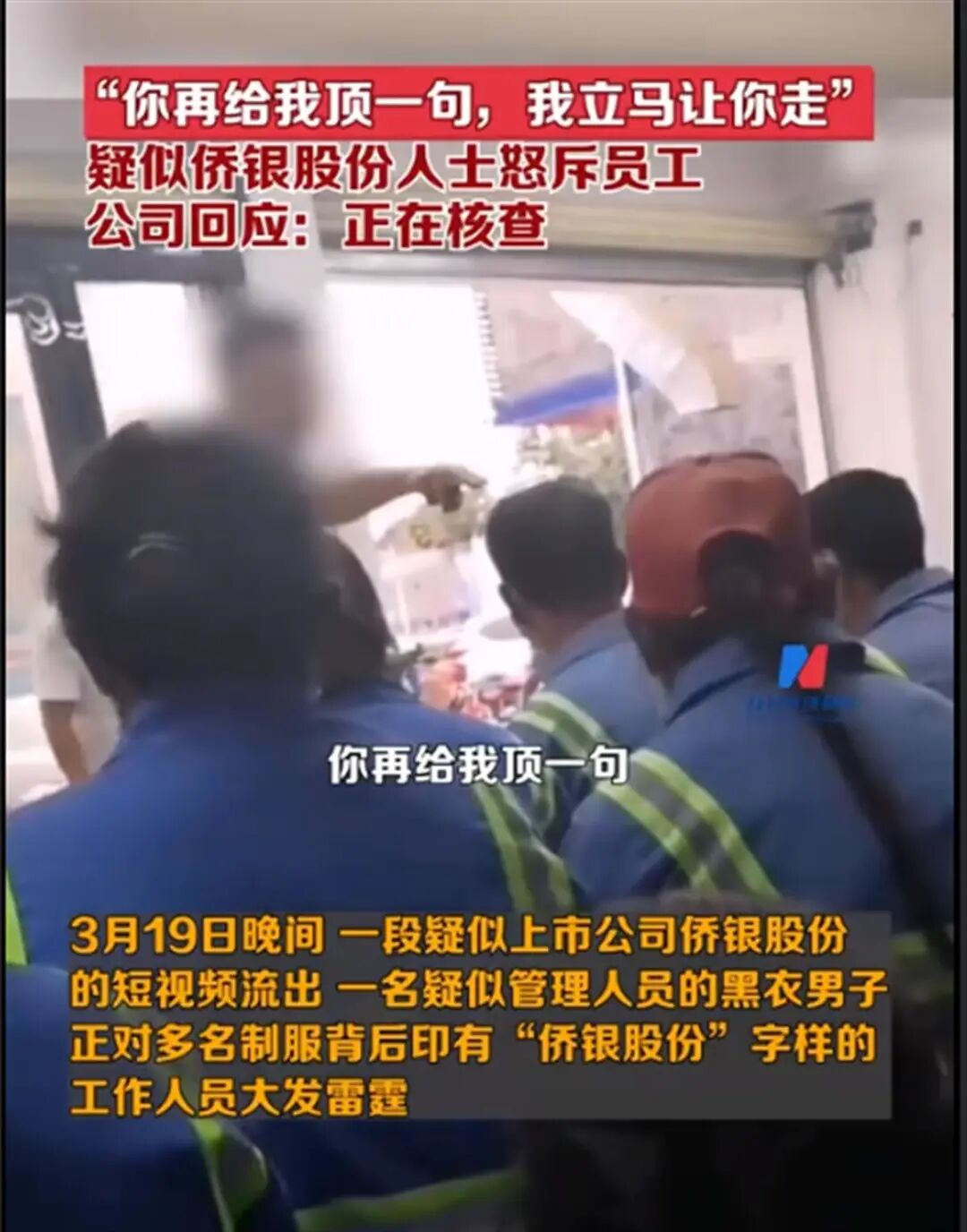 上述视频中,一名男性正站在多名身穿“侨银股份”制服员工面前,用手指着其中一名员工并大声呵斥。看上去男子是一名领导,与这名员工发生了争执,男子称如果该员工再顶嘴“明天就走人”,还扬言要罚该员工500元。