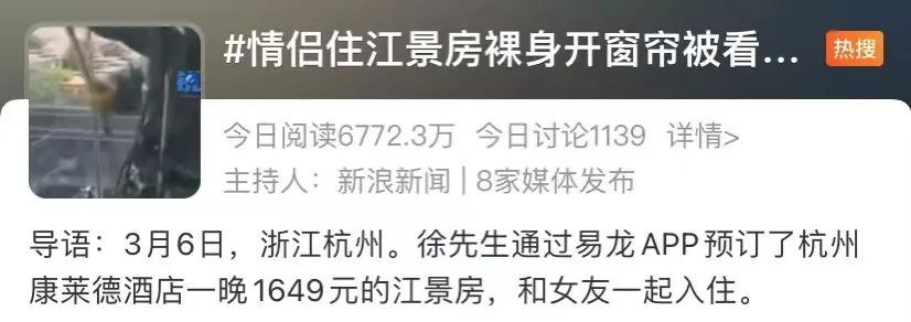 据媒体报道称,近日,杭州徐先生投诉,通过易龙APP预订了杭州康莱德酒店一晚1649元的江景房,自己和女友一起入住。第二天一早,小情侣俩人拉开窗帘看江景,发现窗外居然有人!而此时,两人都没有穿衣服!