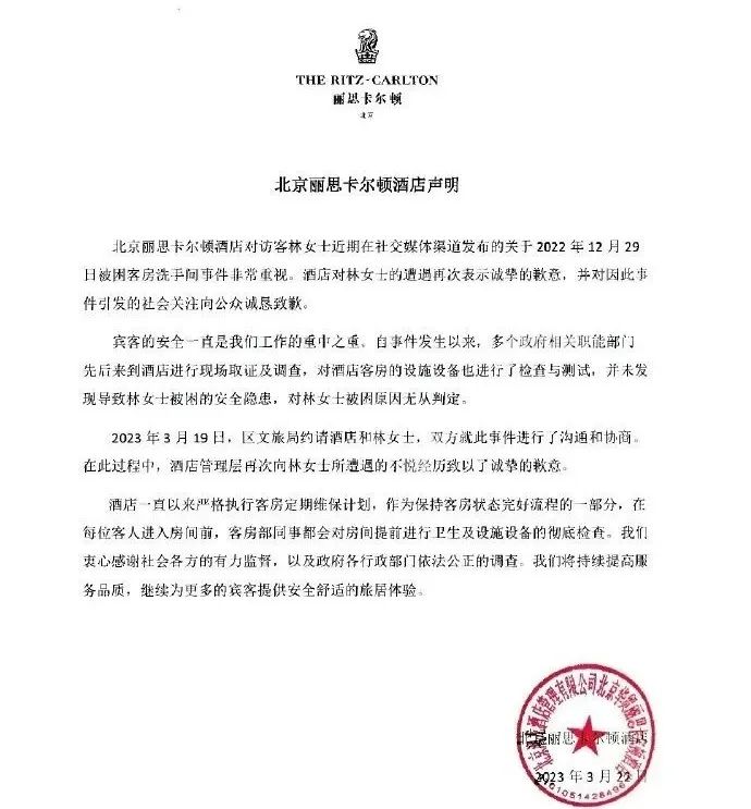 北京丽思卡尔顿酒店对访客林女士近期在社交媒体渠道发布的关于2022年12月29日被困客房洗手间事件非常重视。