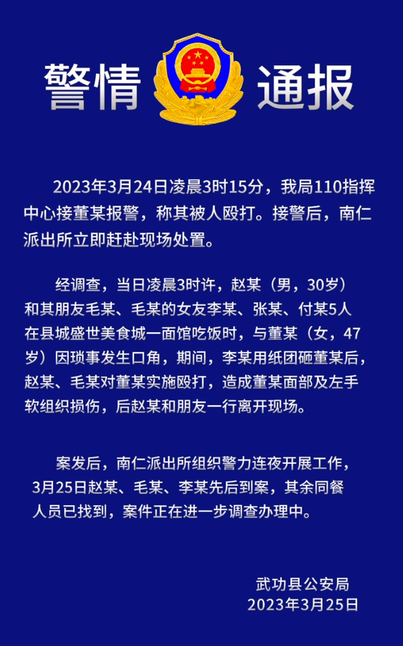 视频剪辑:马星翔3月25日,武功县公安局对此事进行通报。 通报全文:[backcolor=transparent]2023年3月24日凌晨3时15分,我局110指挥中心接董某报警,称其被人殴打。接警后,南仁派出所立即赶赴现场处置。经调查,当日凌晨3时许,赵某(男,30岁)和其朋友毛某、毛某的女友李某、张某、付某5人在县城盛世美食城一面馆吃饭时,与董某(女,47岁)因琐事发生口角,期间,李某用纸团砸董某后,赵某、毛某对董某实施殴打,造成董某面部及左手软组织损伤,后赵某和朋友一行离开现场。案发后,南仁派出所组织警力连夜开展工作。3月25日赵某、毛某、李某先后到案,其余同餐人员已找到,案件正在进一步调查办理中。 此前报道: 3月24日凌晨2时50分许,在陕西省咸阳市武功县盛世美食城,一名女子称自己买饭时,被几个人殴打10多分钟,脸都被打变形了。