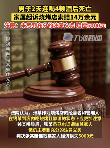 随后,钱某家属将经营烧烤店的张某告上法庭,认为其无限制地售卖酒水,眼看消费者在店里醉酒而不予制止、劝诫、救助,要求赔偿14万元。