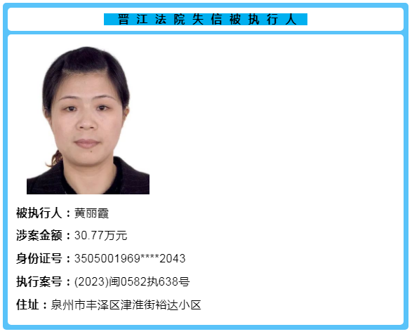 特别说明:1、本期公布的案例信息均由晋江市人民法院提供;2、被执行人未履行义务的具体金额以执行法院的认定为准。来源 | 晋江市人民法院