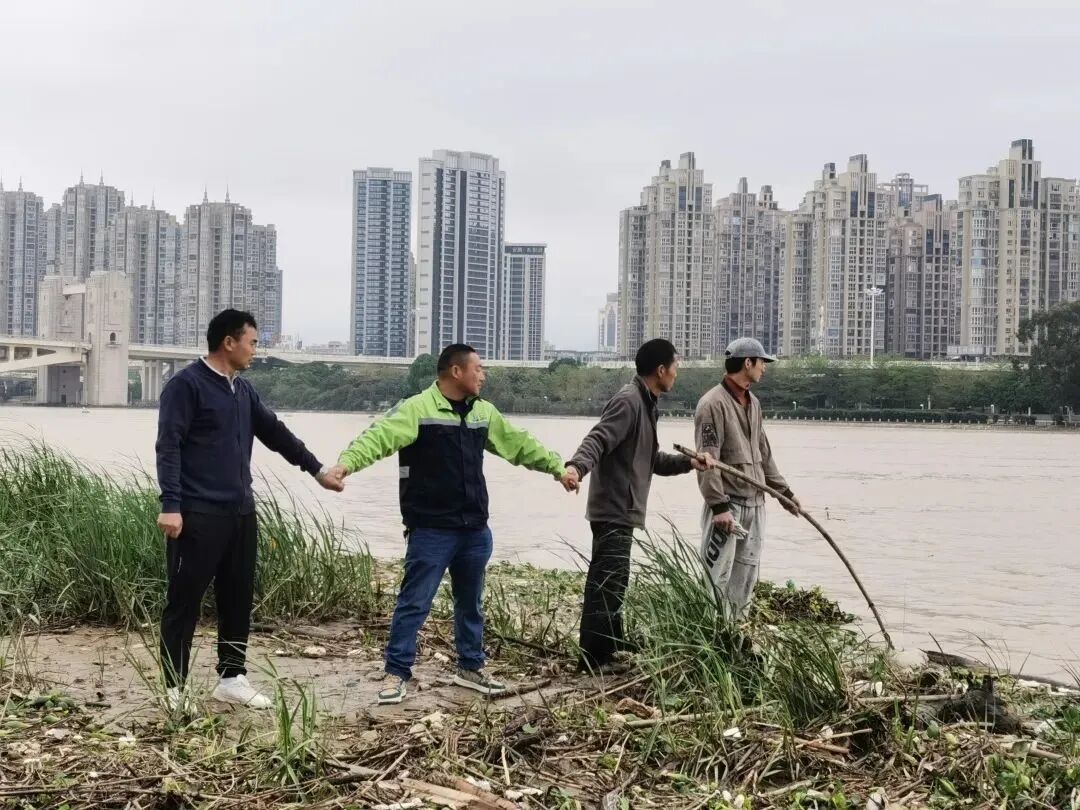 追了长达一公多里地,大家体力都有点透支。最终在南岸生态公园内,一处水流较缓的地方,一群人便开始展开救援。吴文忠介绍,施救地方有个回旋湾,水流速度较慢,把落水者冲到离岸约十五米的地方。