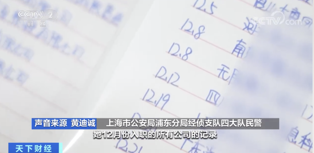 上海市公安局浦东分局经侦支队四大队民警黄迪诚:这是犯罪嫌疑人自己整理的,她去年12月份入职的所有公司的记录。日期就是她入职的时间,间隔都很短。