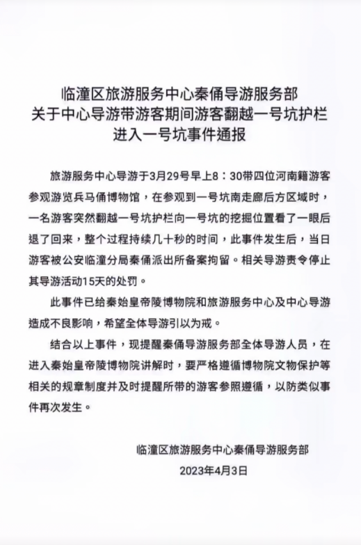 [font="]近日,陕西西安。临潼区旅游服务中心通报,3月29日四位河南籍游客参观游览兵马俑,