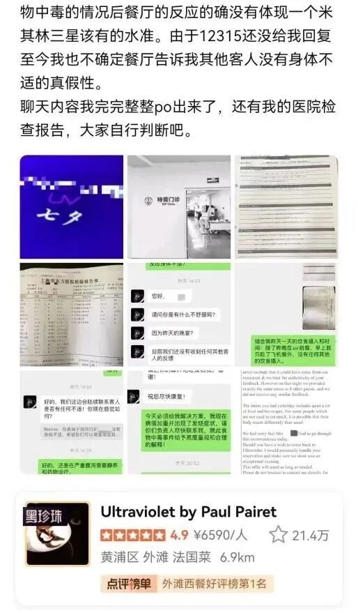 一位“UltravioletbyPaulPairet”餐厅工作人员则告诉记者,餐厅向顾客发送邮件后未得到对方反馈,“他们就直接在网上发视频说自己食物中毒,我们觉得蛮荒唐的。目前还在等待市场监管部门的检查结果。”