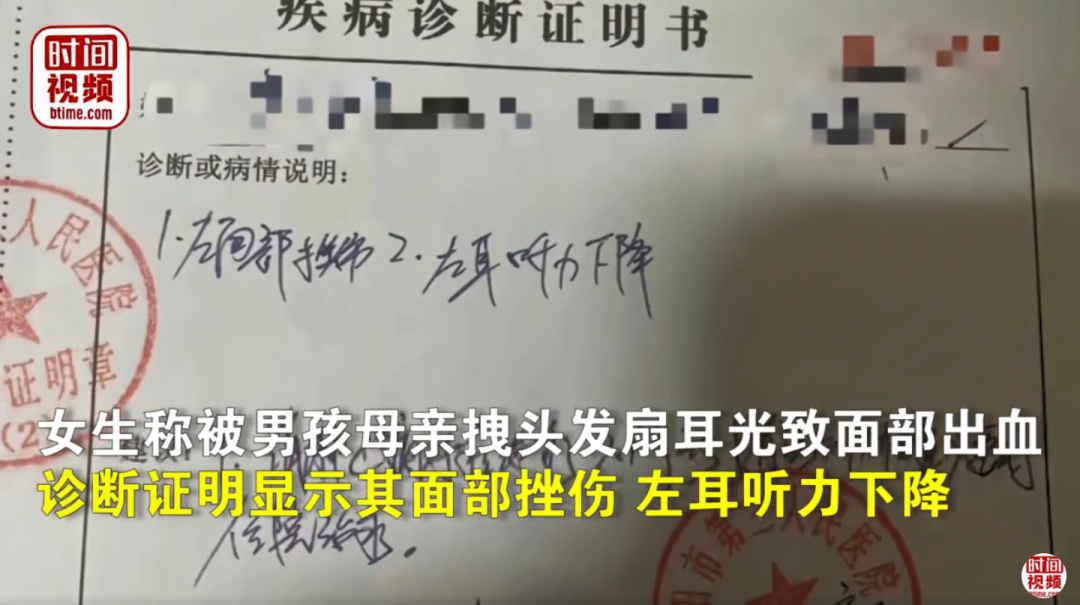 女生出去后提出质疑,和男孩母亲发生争执,对方骂她荡妇并打伤她,诊断证明显示其面部挫伤、左耳听力下降。
