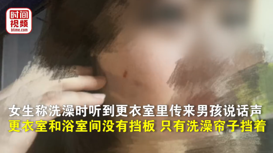 当事女生称,洗澡时听到更衣室里传来男孩说话声,更衣室和浴室间没有挡板,只有洗澡帘子挡着。