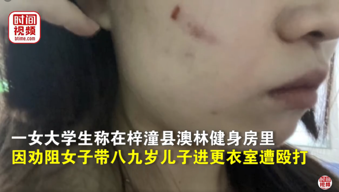 4月8日,四川绵阳一女大学生称在梓潼县澳林健身房里,因劝阻女子带儿子进更衣室遭殴打。