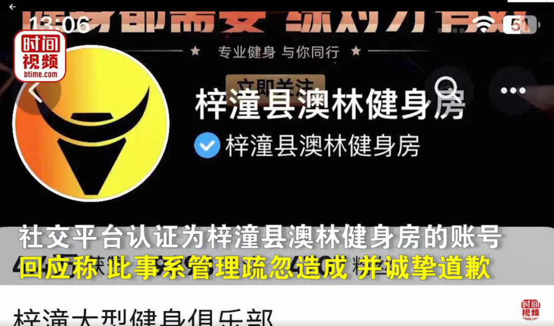 社交平台认证为梓潼县澳林健身房的账号回应称,此事系管理疏忽造成,诚挚道歉,并称男孩7岁,工作人员接到投诉到场后男孩已不在更衣室,警方已介入处理。