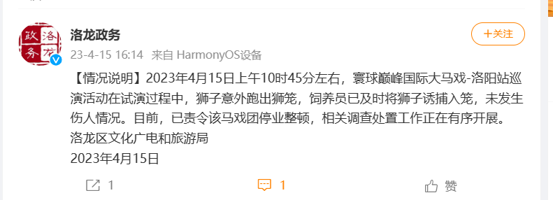 洛阳市洛龙区官方微博@洛龙政务 4月15日发布情况说明称,4月15日上午10时45分左右,寰球巅峰国际大马戏-洛阳站巡演活动在试演过程中,狮子意外跑出狮笼,饲养员已及时将狮子诱捕入笼,未发生伤人情况。目前,已责令该马戏团停业整顿,相关调查处置工作正在有序开展。