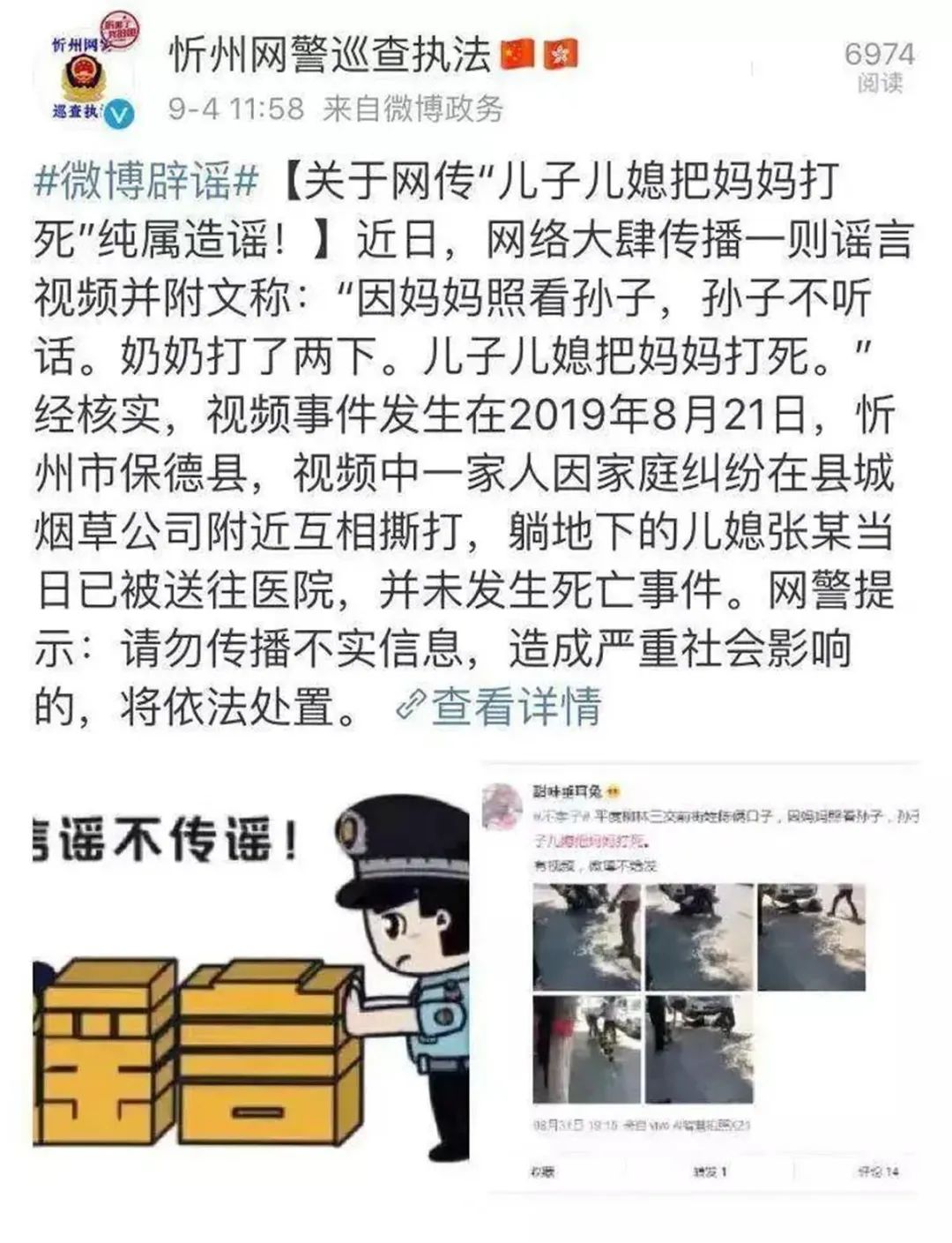 2019年9月,山西忻州网警曾发布辟谣信息,称该视频拍摄于2019年8月21日的忻州市保德县,视频中一家人因家庭纠纷互相撕打,躺在地下的儿媳张某当日已被送往医院,并未发生死亡事件。