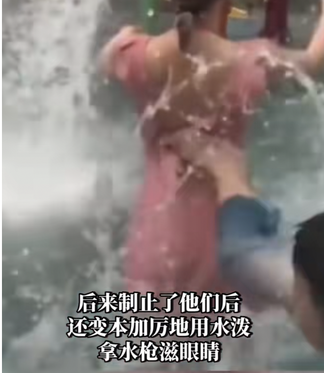 [font=mp-quote, -apple-system-font, blinkmacsystemfont, "]除此之外,还有小孩在女生背后推搡,甚至对着屏幕做出不雅手势。当事人陈女士表示,她们一行人在水上乐园玩的时候,这几个男孩就一直跟着自己,在制止了“熊孩子”的行为之后,他们还是不听劝告地泼水,自己甚至还被水枪滋到了眼睛。随后她和景区的工作人员反映了事情经过,可没想到的是,自己在游玩结束后还是被那几个孩子追着辱骂。