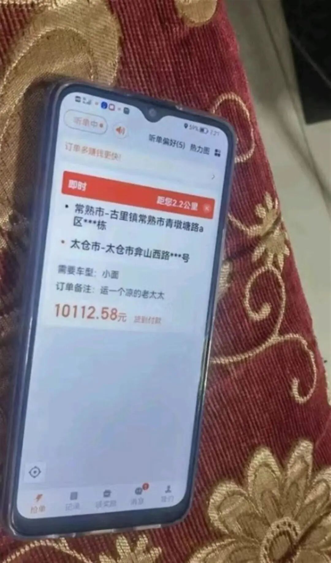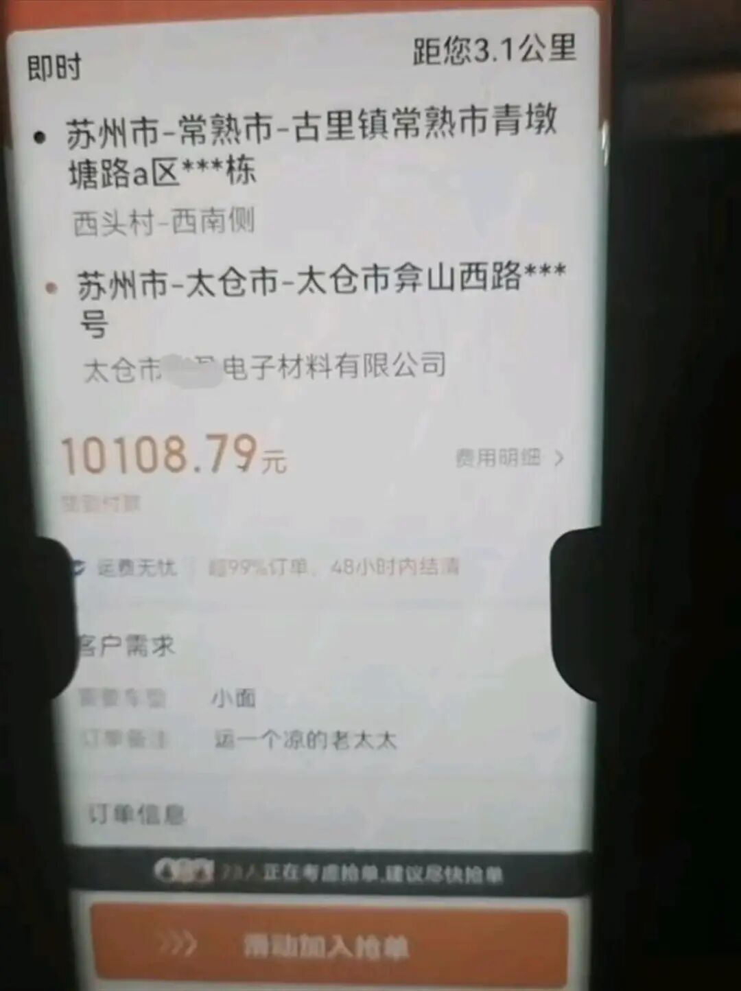 网友发布的视频显示,需要从江苏苏州常熟古里镇青墩塘路a区某栋楼运送一单至苏州太仓市弇山西路的太仓市某电子材料公司,价格约为10108元,货到付款。客户需求除了提到“小面”车型外,还备注称“运一个凉的老太太”。