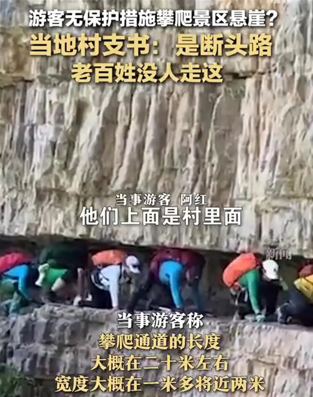 记者向当事游客了解到他们所攀爬的悬崖是龙床口,攀爬通道的长度大概在二十米左右,宽度一米多接近两米,“不是景区里面,是村与村中间的通道。实际通道没有视频里看起来那么危险,这个地方附近有很多类似的通道。”