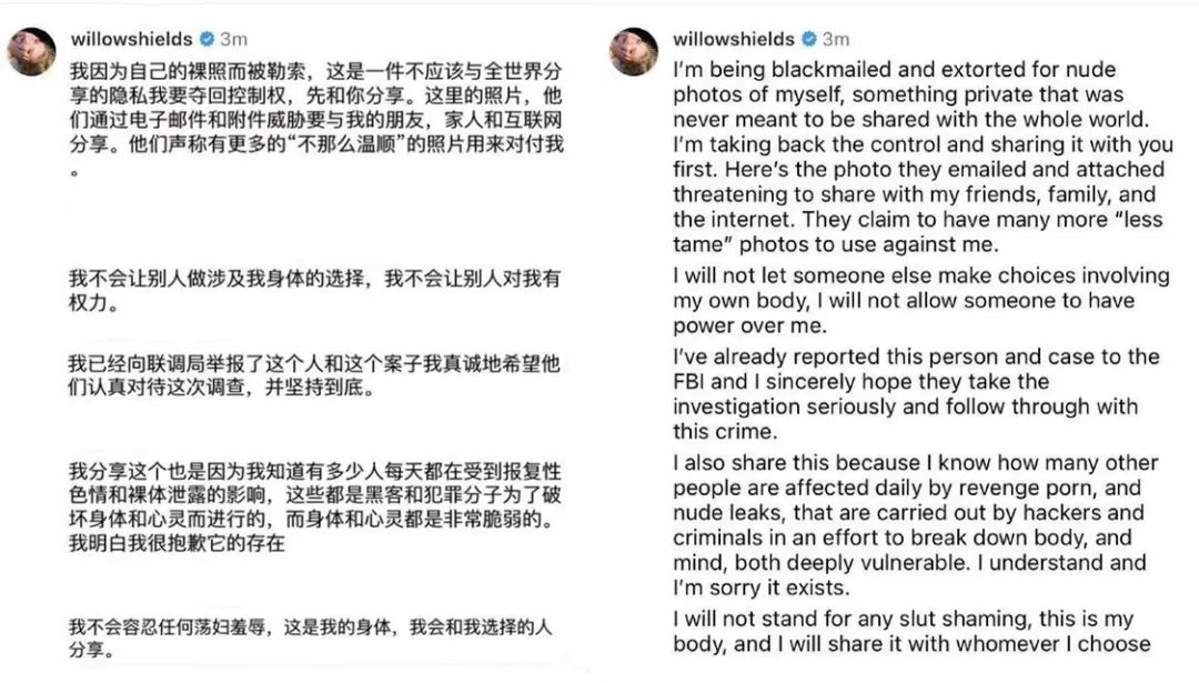 薇洛·西尔德斯也并不是第一个通过晒出私密照片来回击勒索者的女星。近年来,由于偷拍和窃取隐私的恶行猖獗,已有多位女星采取了类似做法来抵制这一恶行。但需要看到的是,无论在多么开放的社会环境中,女性要做出这样的选择,都需要莫大的勇气,需要善意的支持。