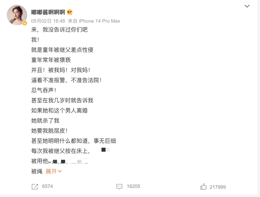5月2日,网红嘟嘟酱在公众平台发文,讲述自己差点被继父性侵的经历。