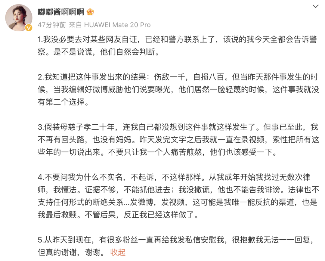 5月3日,嘟嘟酱发文称,已经和警方联系上了,“警察已经介入,我正在警察局配合调查。”
