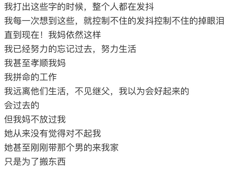文中她讲述自己被继父按在床上等种种行为,当她跑去告诉自己母亲的时候,母亲却说:继父在和自己开玩笑。