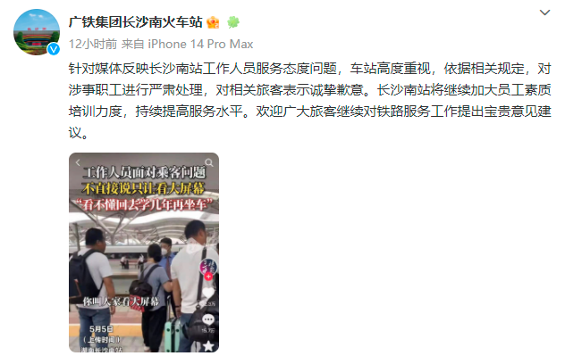当晚,长沙南站微博@广铁集团长沙南火车站 发文称,针对媒体反映的长沙南站工作人员服务态度问题,车站高度重视,依据相关规定,对涉事职工进行严肃处理,对相关旅客表示诚挚歉意。