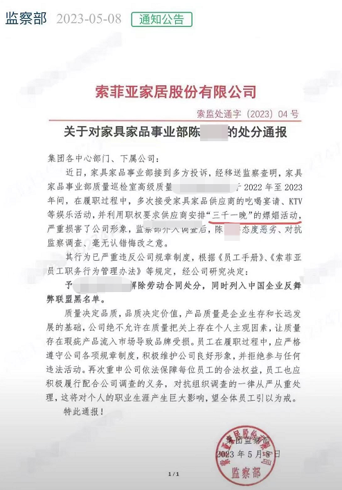 近日,上市公司索菲亚(002572.SZ)的一则处分通报引发关注。通报称,索菲亚一高级工程师多次接受供应商吃喝宴请等,并利用职权要求供应商安排“三千一晚”的嫖娼活动,被解除劳动合同。索菲亚工作人员对媒体证实,该通报属实。 有财经博主爆料称,5月8日,索菲亚监察部发布通报。内文显示,该公司接到多方投诉,经移送监察查明,家具家品事业部质量巡检室高级质量工程师陈某某于2022年至2023年间,在履职过程中,多次接受家具家品供应商的吃喝宴请,KTV等娱乐活动,并利用职权要求供应商安排“三千一晚”的嫖娼活动,严重损害了公司形象。监察部介入调查后,陈某某态度恶劣、对抗监察调查、毫无认错悔改之意。根据通报,索菲亚表示,陈某某的行为已严重违反该司规章制度,根据《员工手册》《索菲亚员工职务行为管理办法》等规定,经该司研究决定:予以陈某某即时解除劳动合同处分,同时列入中国企业反舞弊联盟黑名单。5月9日,据*****·湾财社报道,索菲亚工作人员证实该通报属实。该工作人员称,当天收到多方对于此事的问询,公司对此类情况“零容忍”,会严厉处罚。红星资本局注意到,4月27日,索菲亚发布的2023年一季报显示,营业总收入18.05亿元,同比下降9.7%;归母净利润1.04亿元,同比下降8.86%。截至今日收盘,索菲亚报17.92元/股,涨0.39%,市值为163.5亿元。[font=mp-quote, -apple-system-font, blinkmacsystemfont, "]来源 | 红星资本局