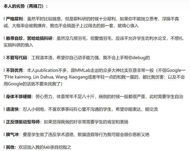 对于招生的要求,邵典写道:正直、善良(做人的前提),不怕吃苦(做科研不是容易的事情),有学术道德(这个是底线),有研究基础(不喜欢数学计算机写代码的就算了),对人工智能有自发的兴趣(兴趣是最好的老师,不要变成我天天逼你去看论文),容易沟通(我就是有啥说啥的性格)。其他要求参见下面的本人招生优势与劣势部分。