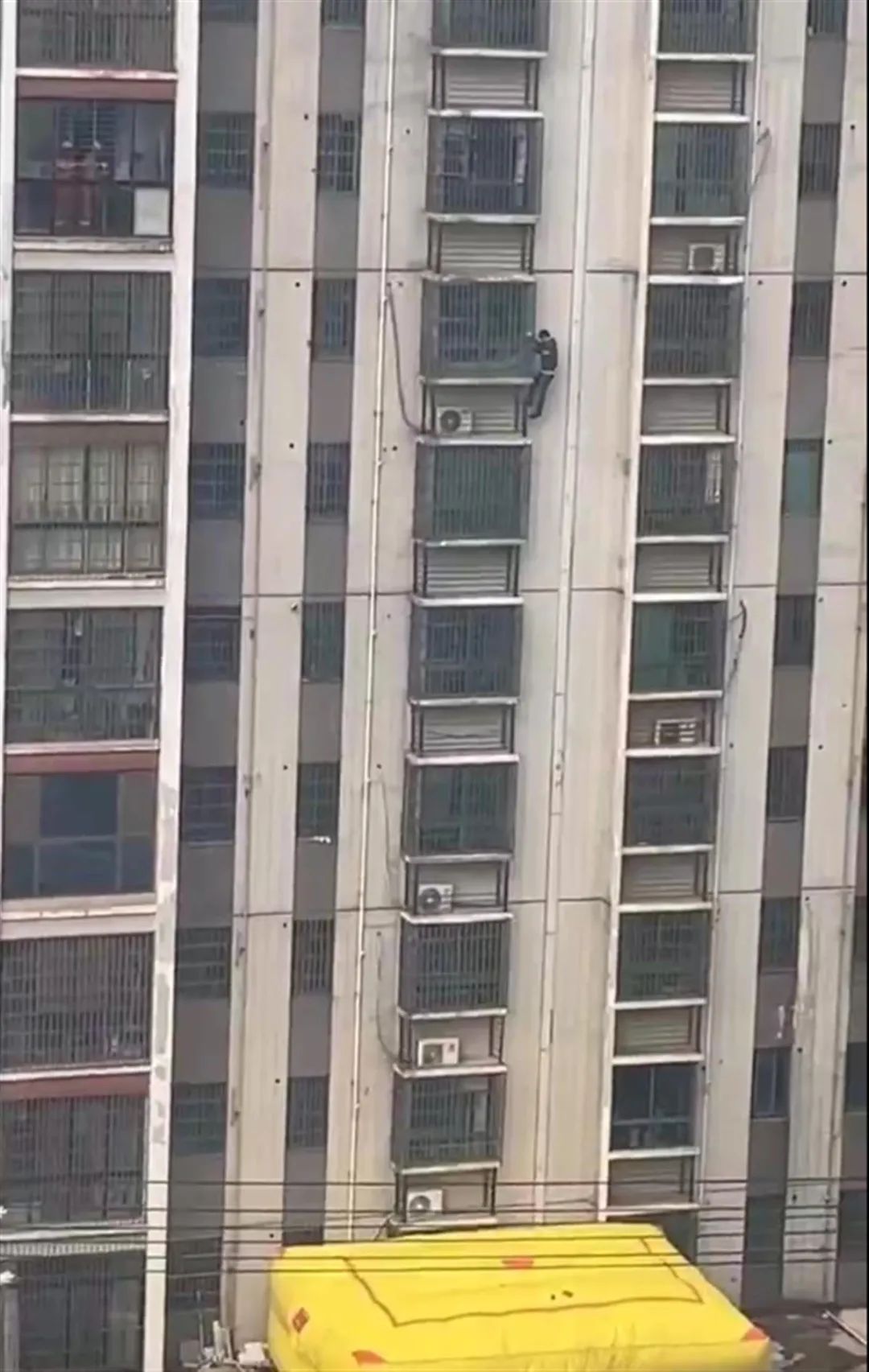 网友发布的视频显示,湖南邵东天贸花苑小区一栋楼的外墙上,一名男子抓着窗台外的防盗网,旁边窗口有警方和消防救援人员察看情况,男子下方的平台上铺有救生气垫。