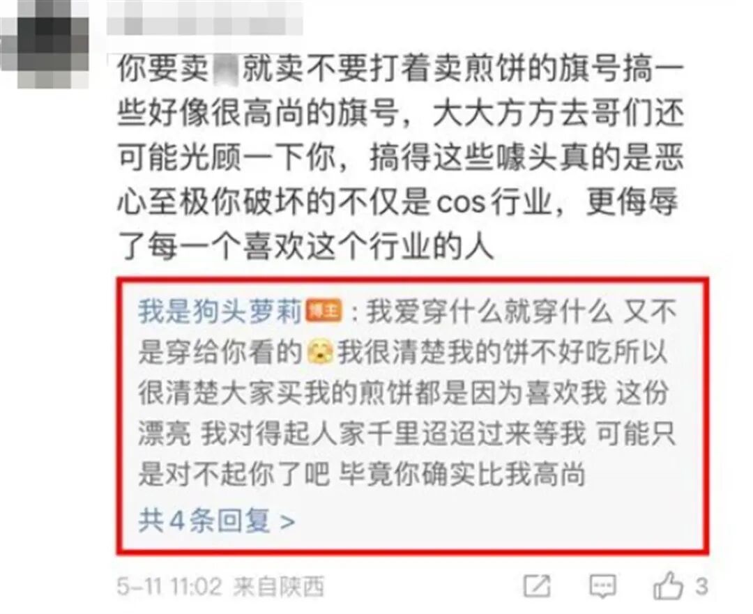 而对于一些网友对她穿着的质疑,“狗头萝莉”也坦然表示,“我很清楚我的饼不好吃,大家买我的煎饼都是因为喜欢我。”随后,该网友删除了相关评论。