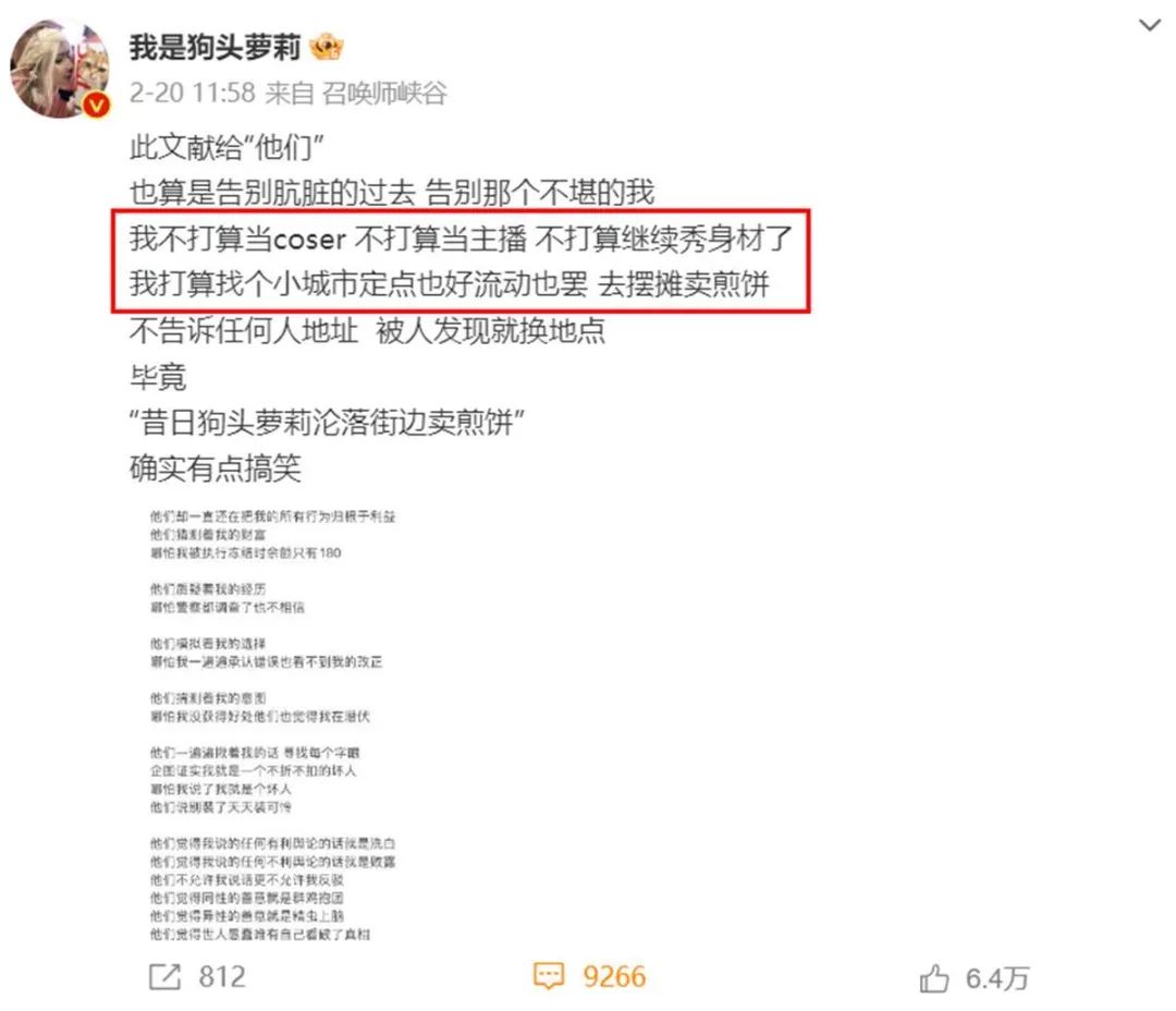 狗头萝莉宣布“退圈”卖煎饼的微博截图