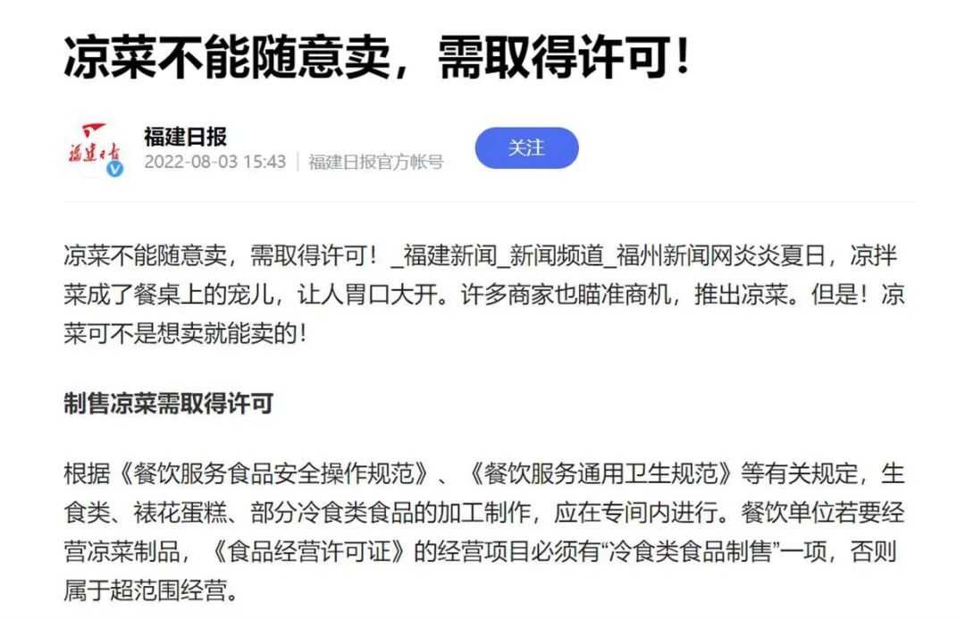 卖凉菜要取得许可,媒体对此多有报道。(来源:福建日报)