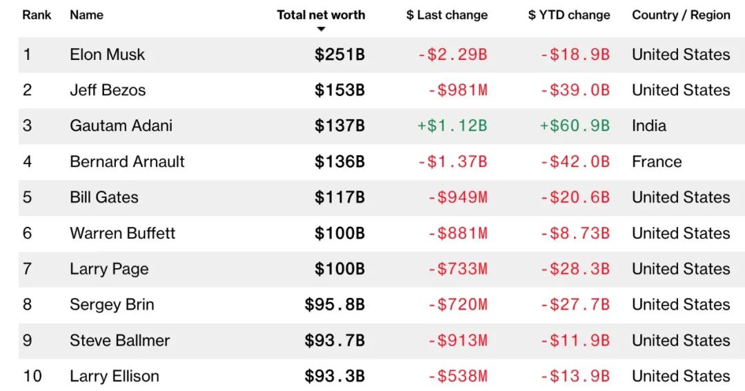 该榜单前十位亿万富翁中,有8位来自美国,1位来自印度,1位来自法国。现年60岁的阿达尼是前十位中唯一一位年内身价上涨的富豪,仅2022年以来,阿达尼财富就增加了609亿美元,是截至目前全球财富增长最快的富豪。