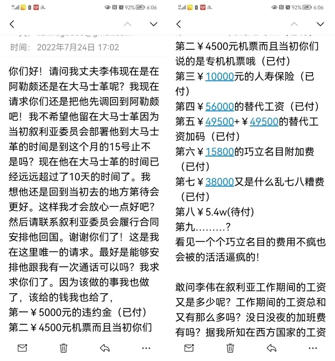 无奈之下 刘女士找到了中国驻叙利亚大使馆的联系方式 “请一定尽快帮我找到*****并把他带回家好吗?他非常想回家,他的工作压力非常大,生病了好多次。”