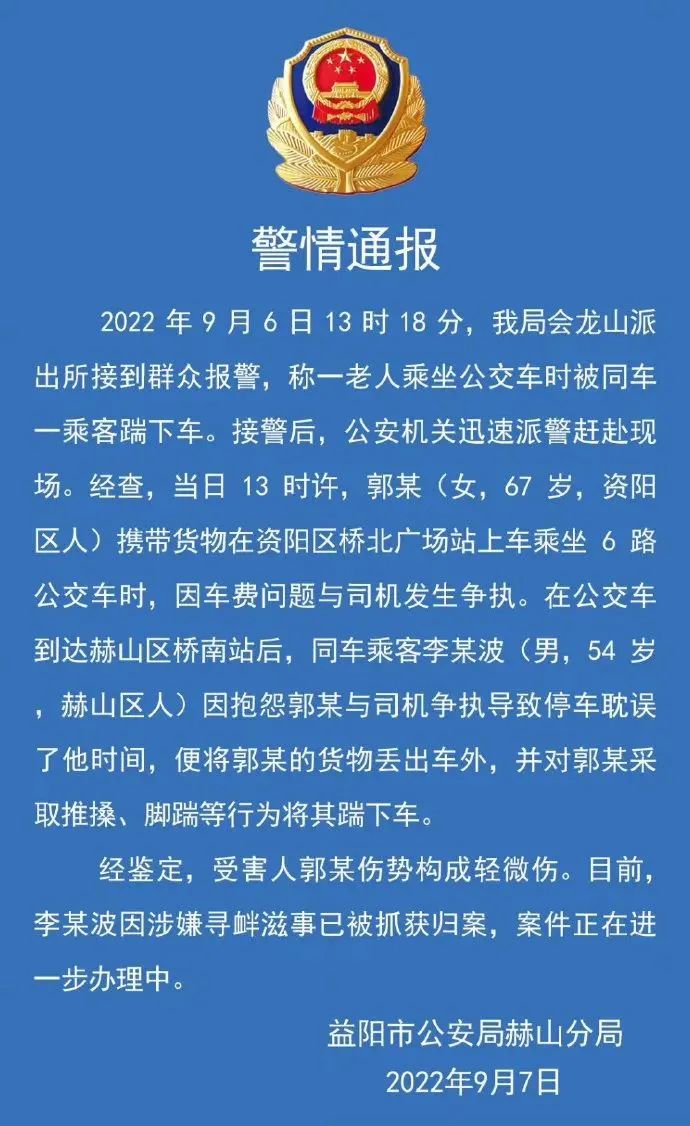 2022年9月6日13时18分,赫山公安分局会龙山派出所接到群众报警,称一老人乘坐公交车时被同车一乘客踹下车。接警后,公安机关迅速派警赶赴现场。经查,当日13时许,郭某(女,67岁,资阳区人)携带货物在资阳区桥北广场站上车乘坐6路公交车时,因车费问题与司机发生争执。在公交车到达赫山区桥南站后,同车乘客李某波(男,54岁,赫山区人)因抱怨郭某与司机争执导致停车耽误了他时间,便将郭某的货物丢出车外,并对郭某采取推搡、脚踹等行为将其踹下车。