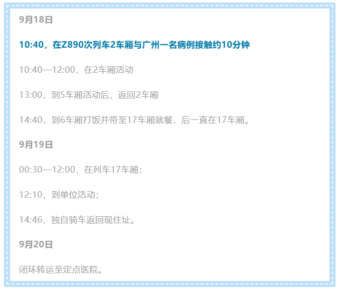 据@陕西交通广播 9月21日消息,2022年9月19日晚,渭南高新区在落实省外来渭人员“落地检”工作中发现一名核酸检测初筛结果阳性人员。经查,该阳性人员骆某某于2022年9月18日16:35自广东省广州市出发,乘火车K1297次15厢14下卧来渭南市;9月19日19:40至20:11在渭南西站临渭区分流登记口进行信息登记、核酸采样。 请在上述时间段、地点有共同活动轨迹人员,以及乘坐同列车人员,务必第一时间向居住地所在社区(村、单位)或属地疫情防控指挥部报备,并配合落实疫情防控措施。如有发热、咳嗽等症状,立即拨打120就医。如隐瞒不报,一旦造成严重后果,将依法追究相关人员的法律责任。 石家庄检出1例阳性感染者涉一列车终点站为北京西 据河北省石家庄市元氏县卫生健康局9月20日通报,9月20日0-12时,石家庄市元氏县新增1例新冠病毒阳性感染者,系外省来元务工人员,为外省协查的密切接触者,在集中隔离点检出。 通报显示,该感染者9月16日乘坐G674次列车(8车厢5F)于21时07分到达石家庄站,在石家庄站西广场进行落地核酸检测和抗原检测后,21时45分乘坐出租车(车号:冀AZG206),22时40分到达高新区宋北村团结大街十五巷3号住所后无外出。当日检测结果呈阴性。 9月17日-9月19日,其轨迹涉一化工园、多个餐馆、生活超市。 9月19日,15时左右作为外省协查的密切接触者由负压救护车转运至集中隔离点。9月20日,在集中隔离点核酸检测结果呈阳性,由负压救护车转运至市定点医院。 记者查询发现,G674次列车始发站是宝鸡南,终点站为北京西,途经西安、郑州东、鹤壁东、石家庄、保定东等站。