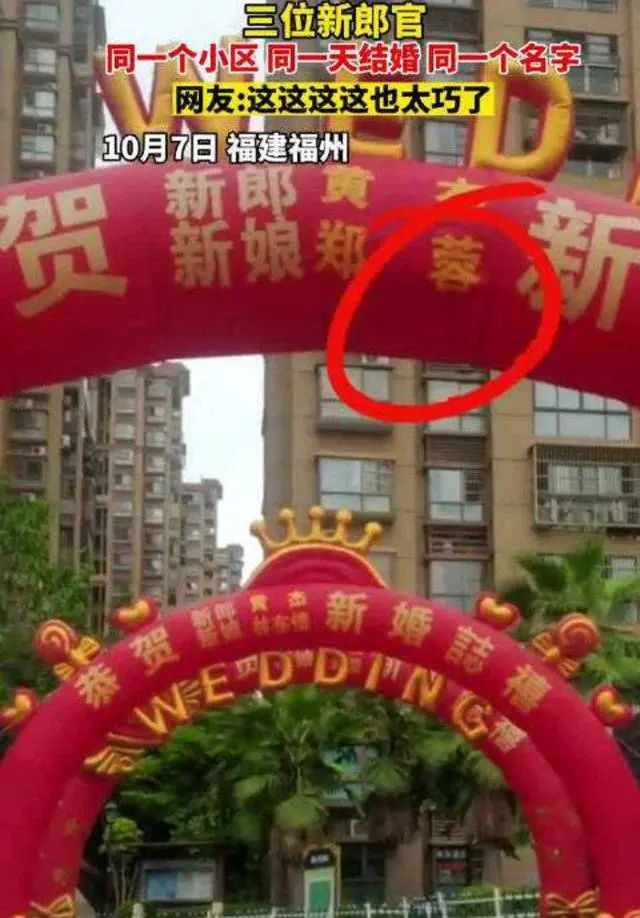 10月7日,福建福州一小区内有三对新人同时结婚,让人意外的是三个新郎都叫一个名字。网友感叹,电视剧都不敢这么拍,也有网友说一定是特殊的缘分让这三个同名同姓的人同一天结婚。