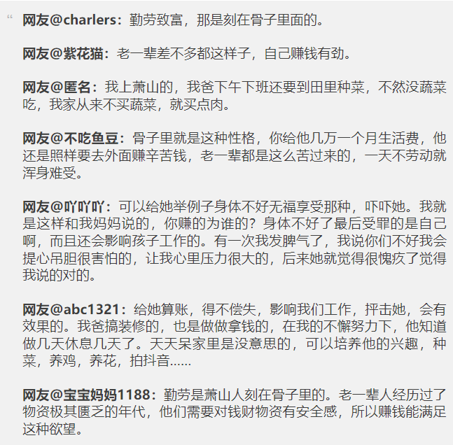 小伙补充说,每月固定给丈母娘钱也不行,给红包她也不要,夫妻俩可以说彻底没招了。家里真的没有压力需要退休老人去赚钱,但丈母娘属于完全停不下来的那种,乌漆嘛黑的还在地里。作为小辈,他更希望丈母娘好好保养自己身体,享受下生活,少生病。拿身体赚钱,可能会加倍还回去。 评论区不少网友表示,自己家也有同款——不管多大年纪,只要干得动,就没有闲下来的时候。也有网友抱怨,老人真的怎么劝都不听,有的甚至上午看病,下去就去干活了。 网友@Mr.花 散步遇到邻居打着手电在挖苗 东片的老人真的拳头握紧才肯休息 ↓↓↓ 有网友说,萧山老一辈确实大多都这样,闲不住,不动就浑身难受,自己赚钱才有劲。有网友认为,还是应该多给老人做做思想工作,工作劳动是好事,但一把年纪把健康搭进去,真的得不偿失。