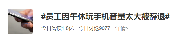 今天下午,#员工因午休玩手机音量太大被辞退#话题冲上热搜,阅读高达1.8亿。