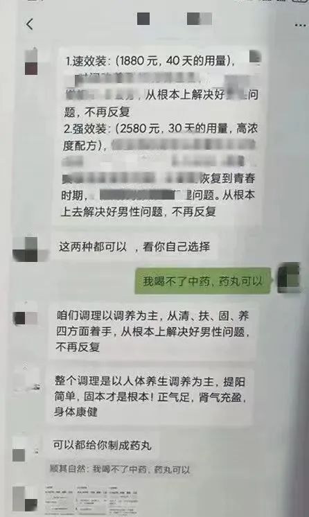 一开始孙先生 也抱着半信半疑的态度咨询 对方随即用大堆专业术语 讲解了孙先生的症状及根源问题 同时把其他人服用他们的产品后 效果好的聊天截图发给了他 并号称“一人一处方,保证疗效好”