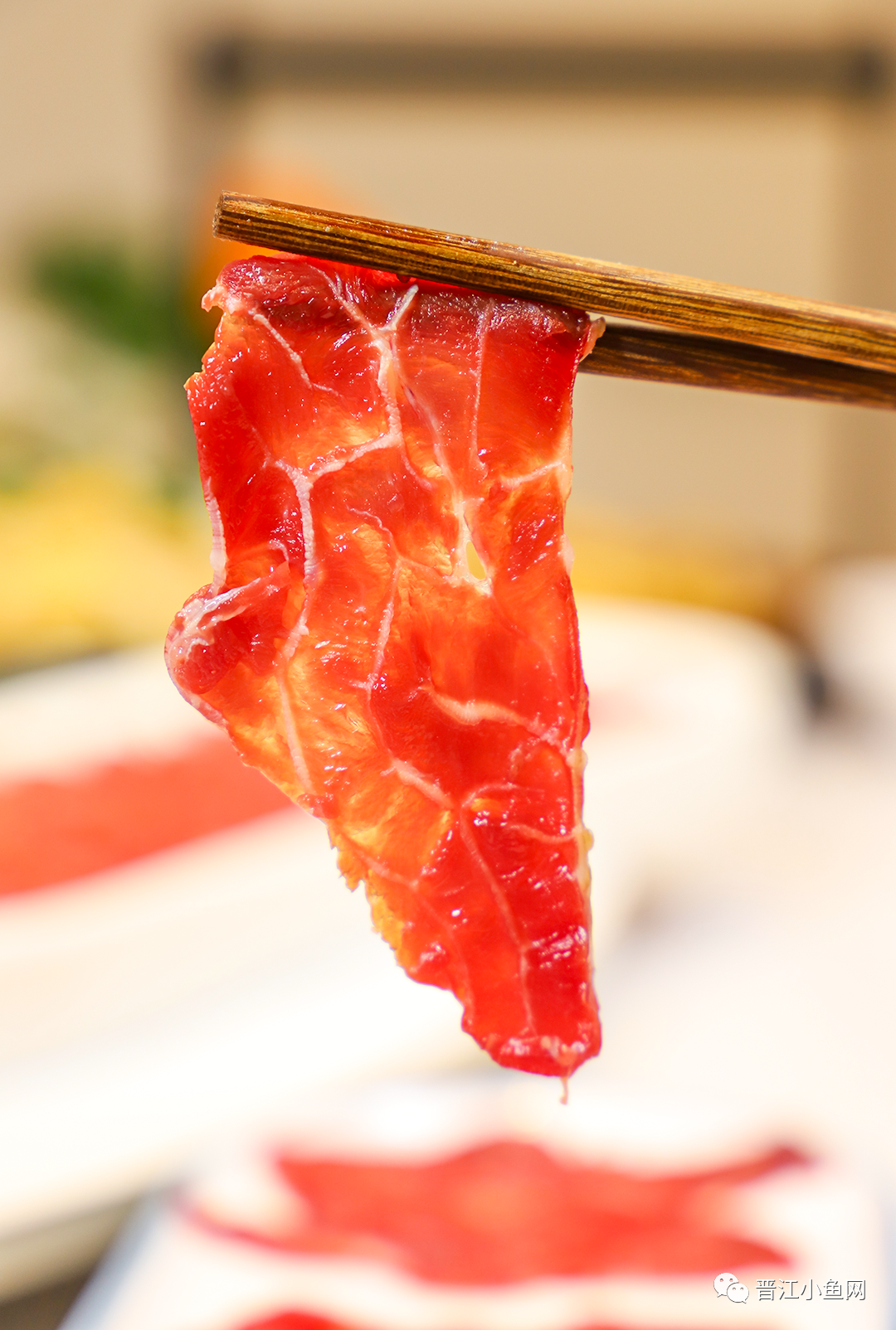 鲜嫩的牛肉像涂了一层光泽亮丽的油 将它们倒入漏网勺中在开水里烫几下 没几秒的时间就成可以蘸料下肚