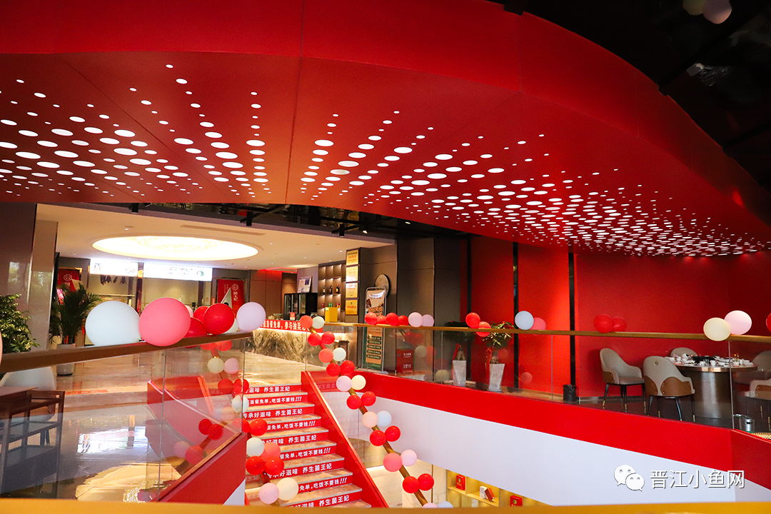 店内装修以红色为基调,简约自然而大气 空间造型也引用了武陵山珍文化的内涵