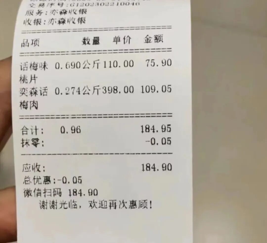 这 位网友表示: 自己去了淮海中路的土特食品商店恰好遇上了她喜欢的上海老牌子奕森 话梅标价199元/斤网友称了半袋以为100多元没想到,最后支付了400多元令她大为震惊!