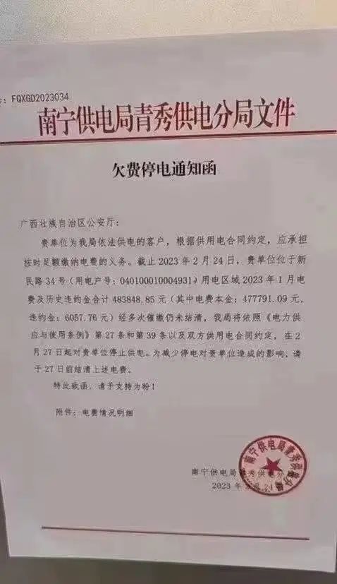 2月27日,一份疑似涉及广西壮族自治区公安厅的《停电通知函》在网络流传。文件提到,该厅2023年1月电费及历史违约金合计48.3万余元,经多次催交未结清,供电单位将从2月27日起停止供电,“请该单位于27日前结清上述电费”。 当日12时许,南方电网广西电网公司客服热线工作人员表示,该用户电费已经结清,不会停电。广西壮族自治区公安厅工作人员也回应,“已经处理完了,不会停电”。
