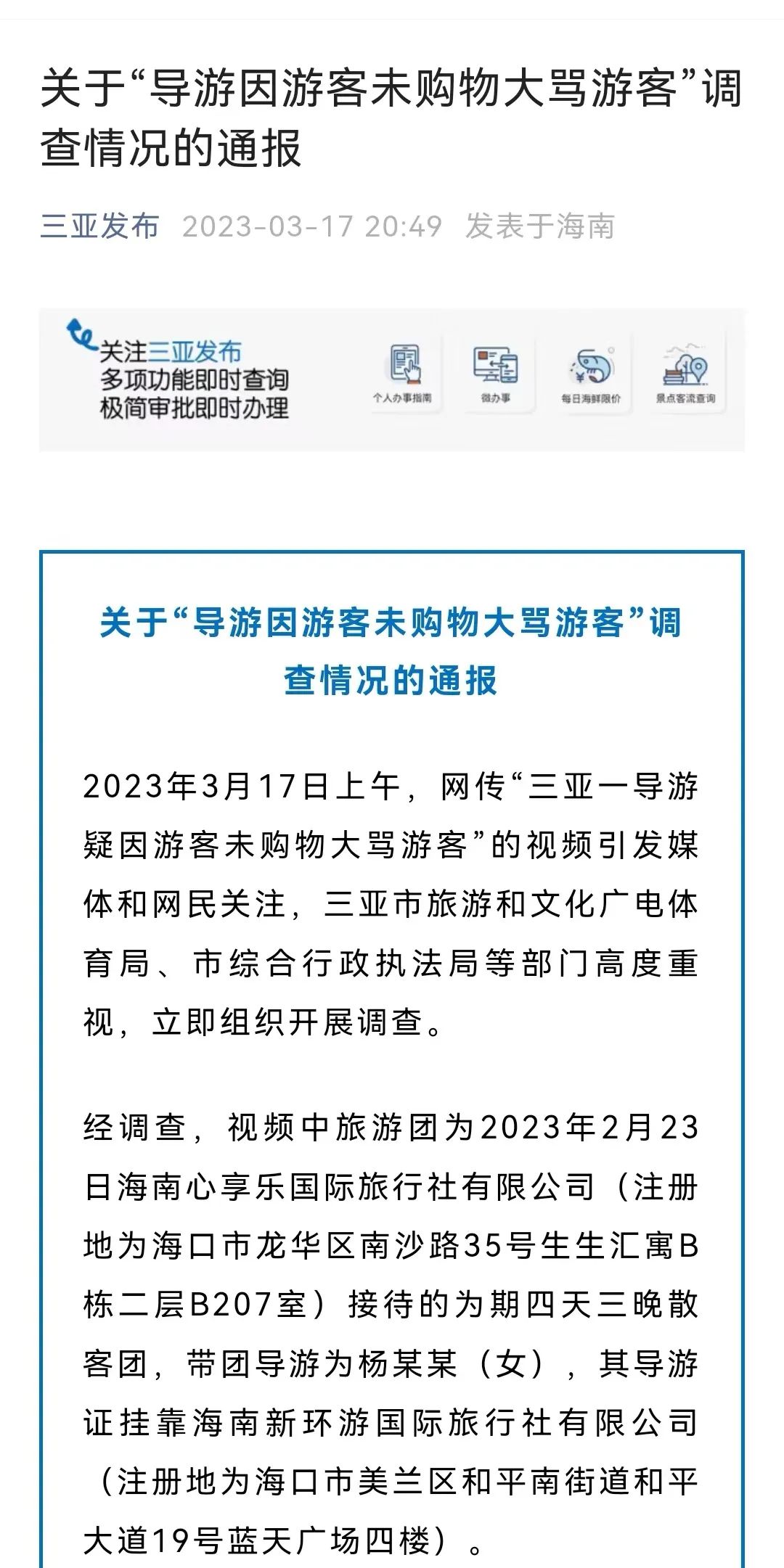 “三亚发布”微信公众号截图 2023年3月17日上午,网传“三亚一导游疑因游客未购物大骂游客”的视频引发媒体和网民关注,三亚市旅游和文化广电体育局、市综合行政执法局等部门高度重视,立即组织开展调查。 经调查,视频中旅游团为2023年2月23日海南心享乐国际旅行社有限公司(注册地为海口市*****区南沙路35号生生汇寓B栋二层B207室)接待的为期四天三晚散客团,带团导游为杨某某(女),其导游证挂靠海南新环游国际旅行社有限公司(注册地为海口市美兰区和平南街道和平大道19号蓝天广场四楼)。 目前,海口市*****区综合行政执法局责令旅行社提高从业人员及导游服务质量;对涉事导游已制作《调查询问笔录》,将依法依规处理。市民游客如发现旅游市场违法违规经营行为,可立即拨打三亚市政府服务热线0898-12345。针对旅游市场违法违规行为,我市相关部门将严厉查处,绝不姑息。 今天(3月18日)凌晨, “海口发布”微信公号发布 《关于网络平台传播“导游因游客未购物恶劣态度对待游客”舆情调查情况通报》